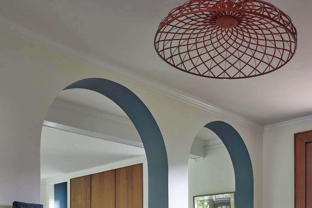Arches in the home’s foyer dictated a departure from more typically linear modern design. Splashes of color in the arches and in fixtures such as a dramatic red ceiling light announce a bold take on tradition.