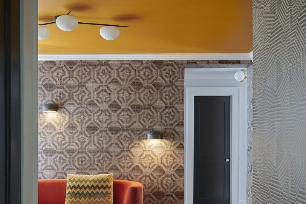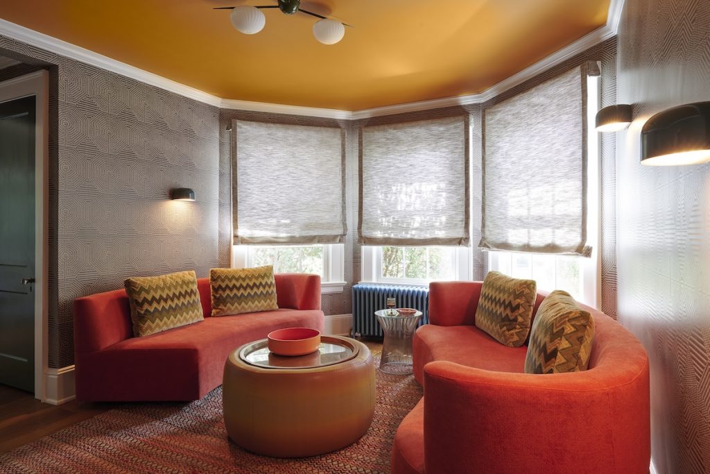 The family room feels both modern and cozy with a combination of retro colors in furnishings and the ceiling, a dynamic but not overpowering texture on walls and Jetsons-like light fixtures. Clean Roman shades help control light for reading and TV viewing.