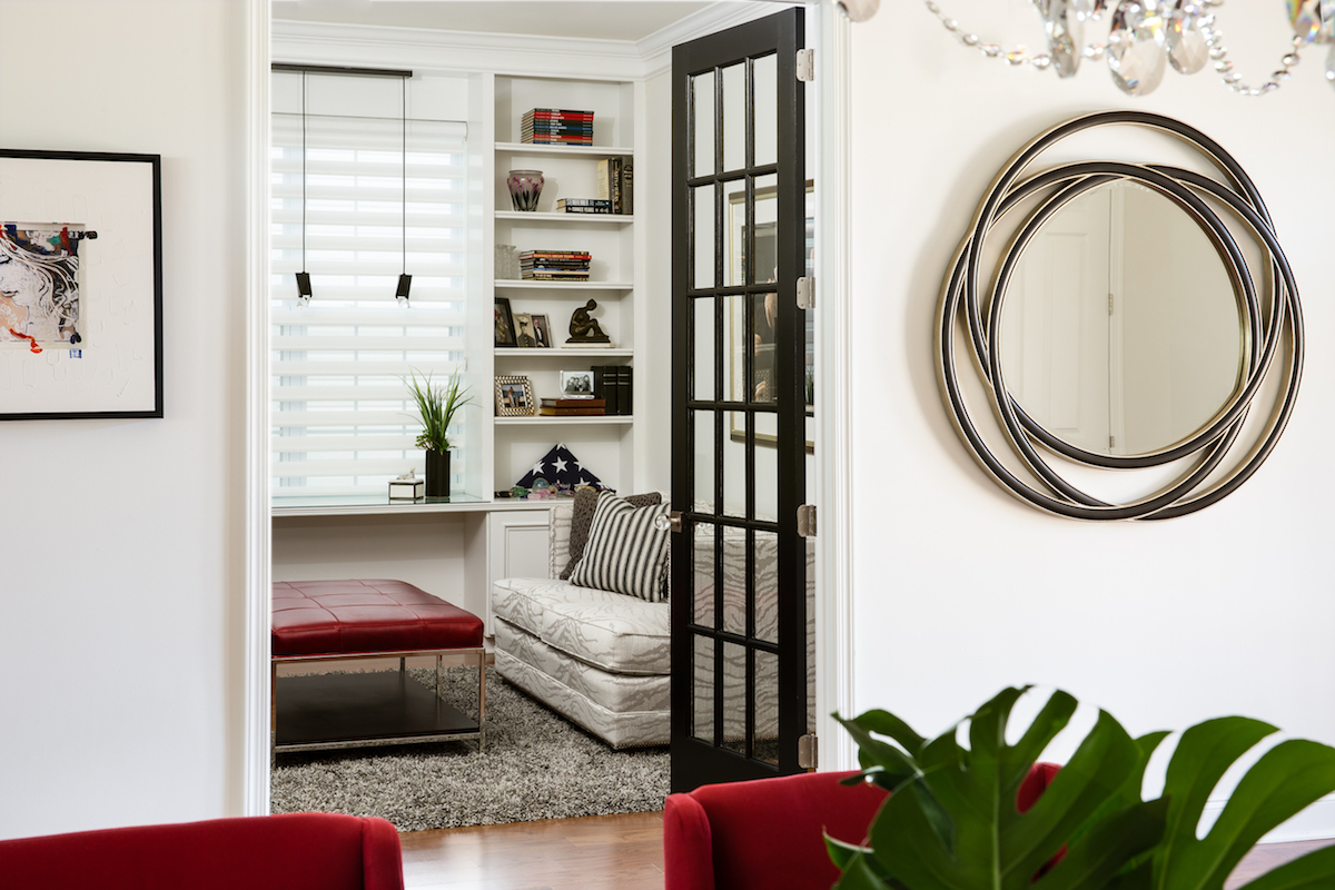 For eating at home, the couple primarily sits around the extra-large, white marble-topped island in a pair of counter chairs in the breakfast area that are covered in an easy-to-care-for black-and-white fabric (which is also used for the chairs around the round steel-and-wood breakfast table). Unsurprisingly, it is the most popular room in the house.