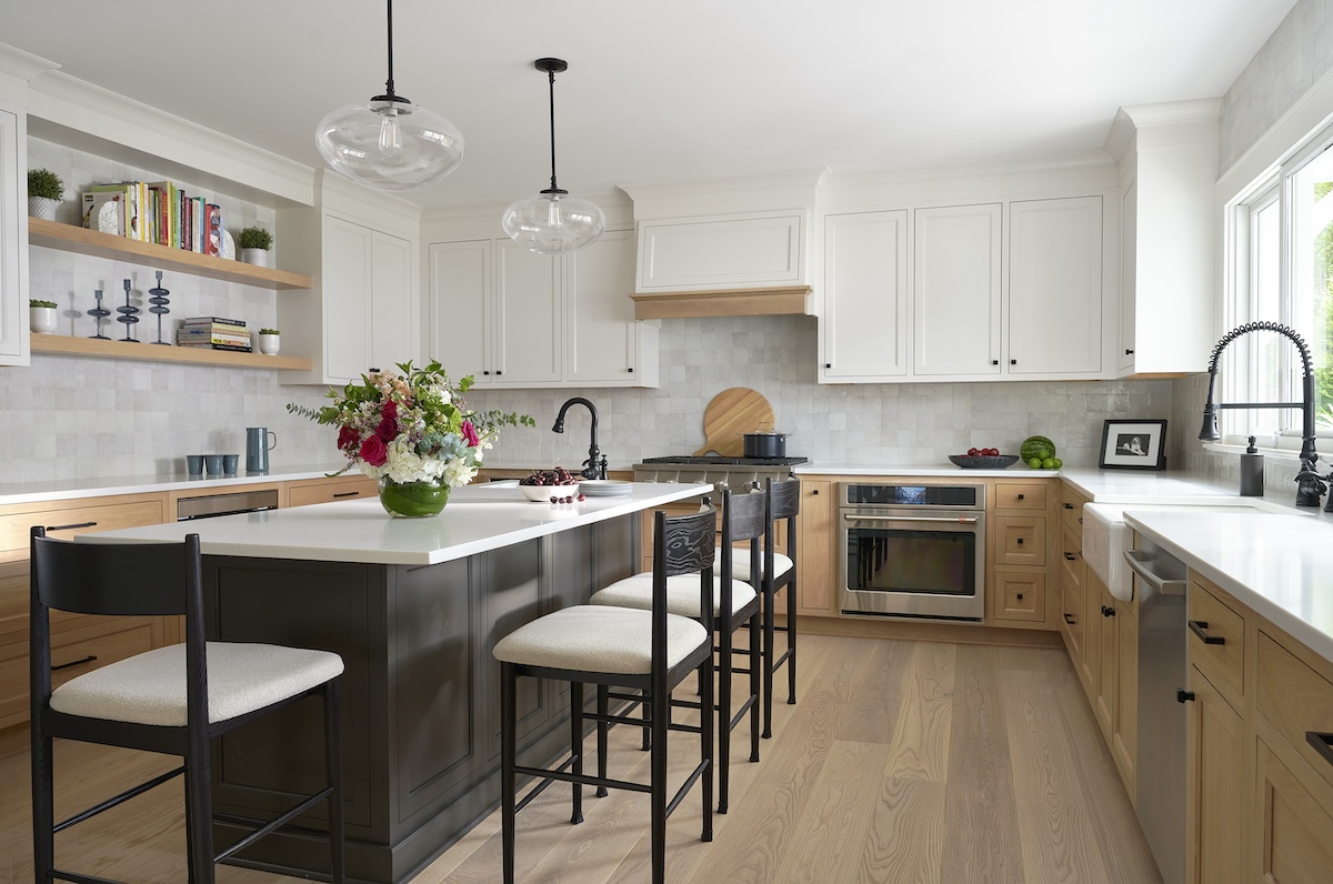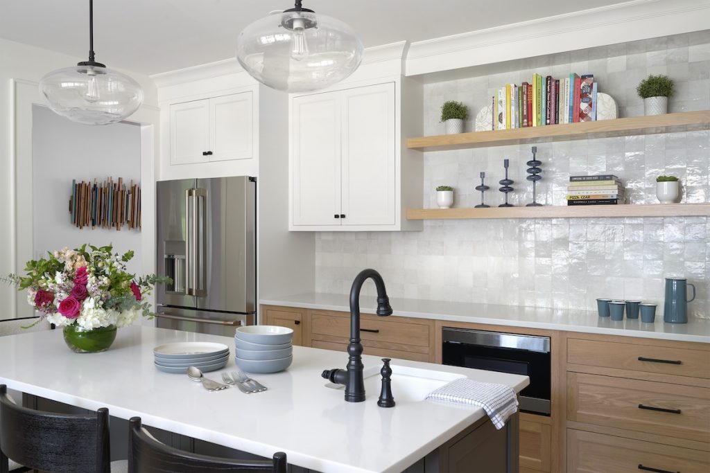 For added interest, the designer chose floating shelves—where accessories lend color—and a textured backsplash of snow Zellige from Tile of Ezra, teamed up with white-and-gray quartz countertops. She then accented with black in the clear glass pendants by Rejuvenation, pulldown faucets, cabinet hardware and ebony-and-ivory stools.