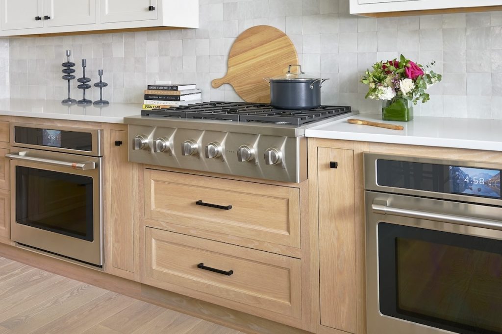 For Kim, who likes baking and cooking, Walzer provides ovens on either side of the cooktop, all Café appliances, along with pullouts for essentials like spices, and an island prep sink. Dana, who previously focused on cleanup, appreciates that there is a zone for that too, with a Kohler undermount sink and a Bosch dishwasher. But you’re likely to see Dana cooking these days as well, now that the two can work in an organized workspace without bumping elbows.