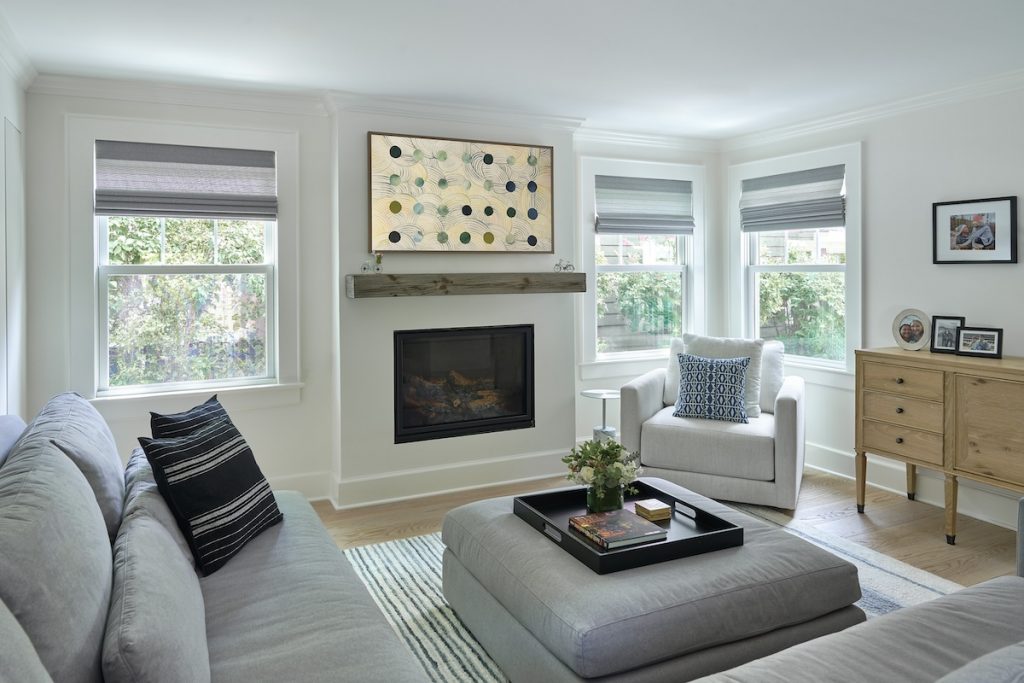 The project remedied not only the kitchen but also the family room, out of which Walzer carved a mudroom. The family room didn’t suffer from the lost square footage, but gained its first fireplace—with unique fireproof construction boards by Promafour and a faux wood-beam mantel. It’s just the clean, modern look the clients wanted. To give the fireplace center stage, Walzer arranged for new windows in a new spot. She also enlarged the opening between the family room and the kitchen and replaced the acoustic tile ceiling. The couple’s existing furniture fits the neutral and transitional design they wanted—thus it remains.