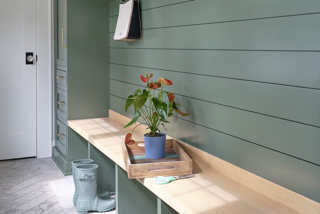 The mudroom is perfectly located where the couple walks in from the garage. Deviating from neutral tones and the Carlisle engineered oak flooring throughout, its design offers Lilypad green, custom cabinets by Mouser and a herringbone-pattern pewter-gray tile floor from Virtue Tile. Storage is everywhere, even under the bench, warding off chaos.