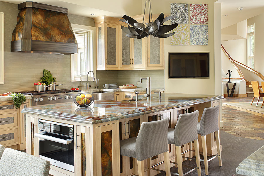 Dominating the outside wall of the space is a masterpiece in its own right: a custom-made forced patina steel hood. It caps an eight-burner Miele gas range set into a natural quartzite Leathered Taj Mahal countertop (yes—it feels like leather!), the shell of which is the handiwork of SimplyAmy Luxury Artisans of Milford. Blow-torched to produce a swirling blend of browns and oranges with a barely discernable hint of blue, the hood matches the cold-rolled steel panels on the 10-foot-by-4-foot island, which anchors the space. A 30-inch stainless steel farm sink with apron by Texas Lightsmith sits below one of the windows flanking the hood. The backsplash, a glass mosaic by Frangi Pani, yielded yet another opportunity to switch up materials and add texture.