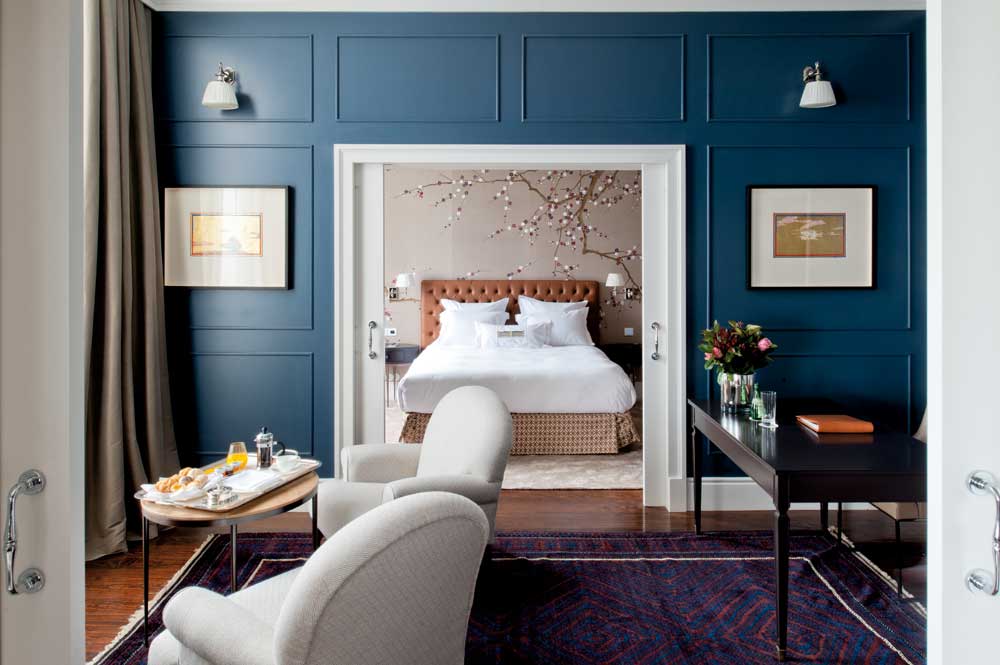 At the Vidago Palace in Portugal, this contemporary beige headboard complements the suite’s deep blue walls—and the eye-popping cherry blossom wallpaper.