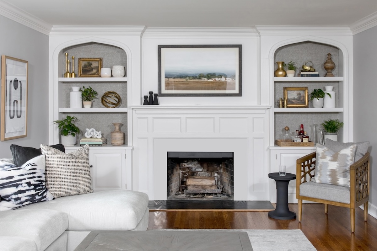 A focal point in the living room is the fireplace, so Granert treated its flanking built-ins to Thibaut grass cloth. The grass cloth, which she calls a welcome alternative to floral wallpaper, delivers dimension to shelving niches. Because antique mirror tiles above the fireplace contributed neither warmth nor dimension, she worked with an art curator to procure the landscape painting that now ties in the warm brown of hardwood floors. Not a strong pattern, but a ribbed texture with sheen enhances the monochromatic Jaipur rug, she says.