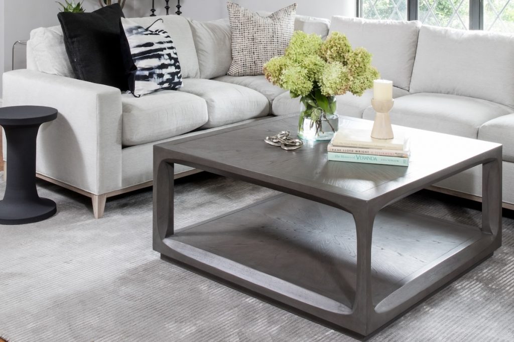 Chosen for its rich gray tone and handy shelf, the Lexington Furniture coffee table pairs nicely with the living room’s custom sectional.
