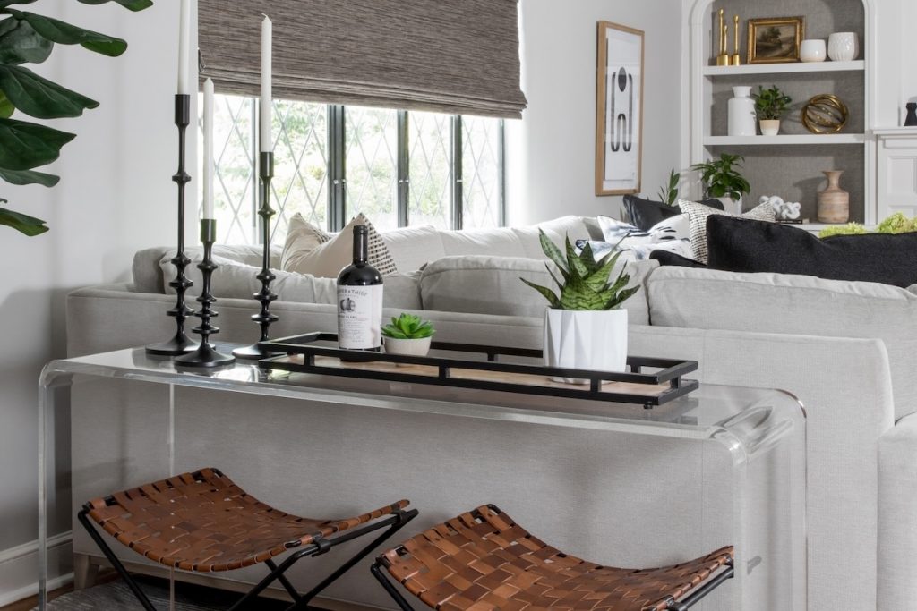 A Lucite table adorned with a metal tray and candlesticks elevates the back of the sectional.