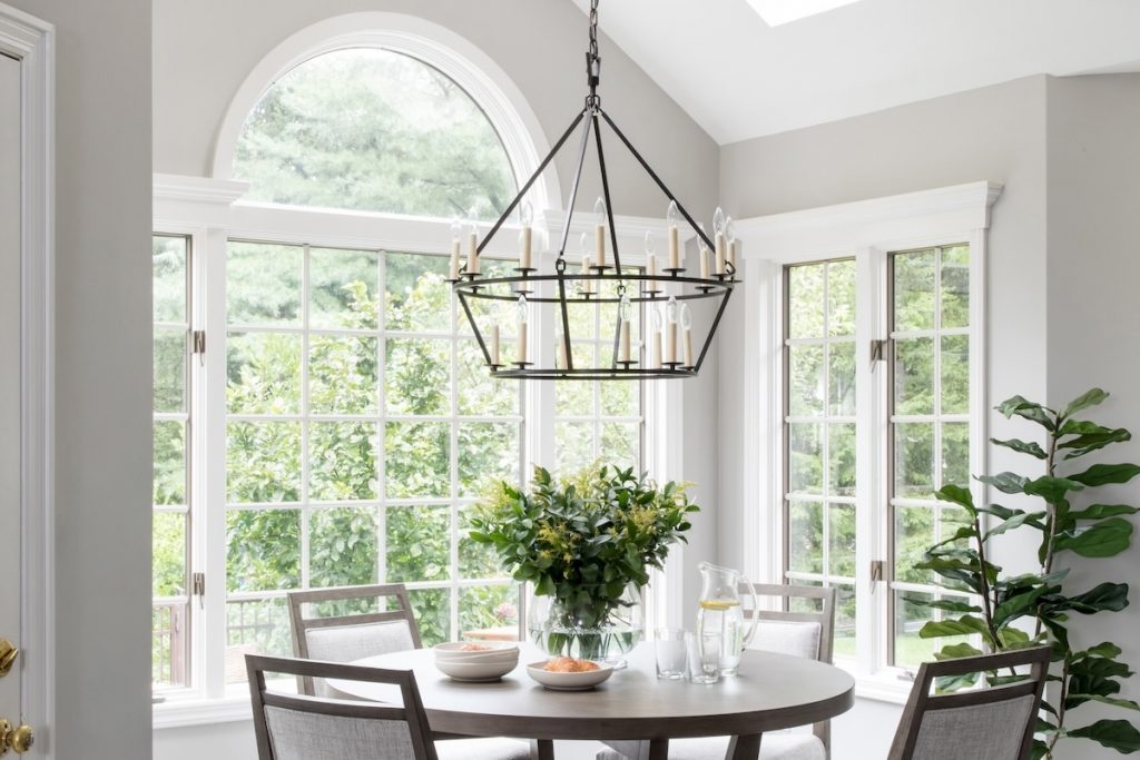 Bountiful windows that bathe the breakfast nook in sunlight are adorned with a decorative arch for beauty inside and out.