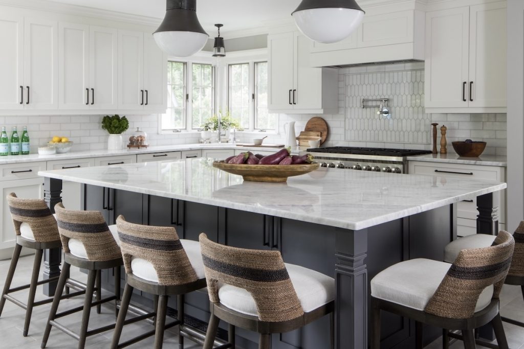 The client got the redesign rolling by seeking a gray-and-white kitchen. As per the wish list, the island features a dark gray base, which teams up with richly veined Shadow Storm quartzite—on the perimeter counters as well. “My preference is natural stone because of the movement and interest,” the designer says of the quartzite. To further catch the eye, white marble subway tiles say “oh-la-la” under the white custom hood, where Granert deviated with a picket pattern.