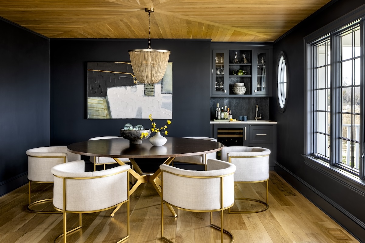 Although smaller in scale, the dining room with its grand design is in no way underwhelming. “With most of the home so bright and airy, we wanted to create a space with a bit of drama,” says the designer. “Since it’s more intimate, the dining room was the perfect space to create a moody atmosphere.” The room is punctuated by Benjamin Moore Hale Navy. In contrast to the adjacent room’s double-floor ceilings, the dining room’s 8-foot ceiling—white oak panels in a perpendicular pattern—encloses the space, enhancing the sense of intimacy. The RH Maslow Spider round dining table encourages cozy conversations; the Wexler chairs represent refined modernity, while special accents—like decorative pottery crafted by one of the daughters—lend homey touches.