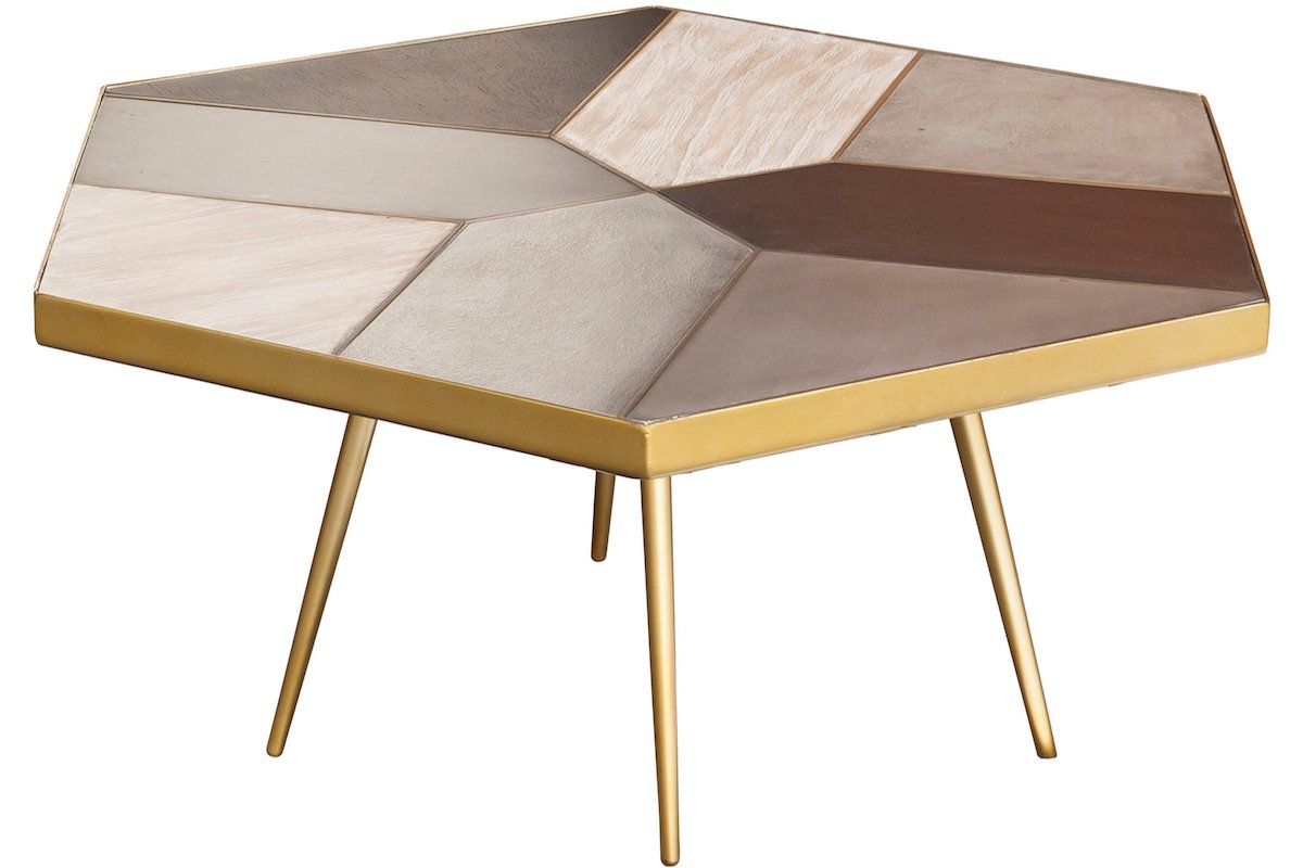 The brass and oak parquetry of this buzz-worthy honeycomb-shaped Giselle coffee table is both rustic and modern at the same time. Available at Lugano Furniture, Paramus.