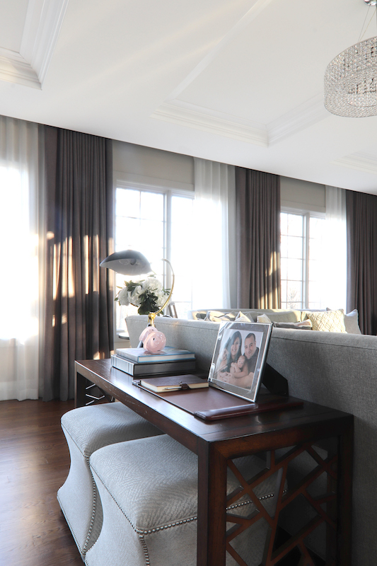 The great room also reflects the family’s desire to live communally. An open-concept layout allows them to be together even if they’re engaged in different activities. And while the spacious room encompasses living and dining areas and a kitchen, it’s still imbued with the cozy feeling the D’Agostinos loved in their previous, smaller home, thanks largely to clever design: While the ceiling is elevated in the entryway and over the dining alcove to take advantage of the glass walls, it’s deliberately lower over a large part of the great room. In the living area, three smaller windows, punctuated with dark draperies, add to the feeling of coziness. There are no curtain rods to interrupt the sense of enclosure: The draperies actually are recessed into the ceiling. “I tried very hard to volley back and forth between closed and open,” D’Agostino says.