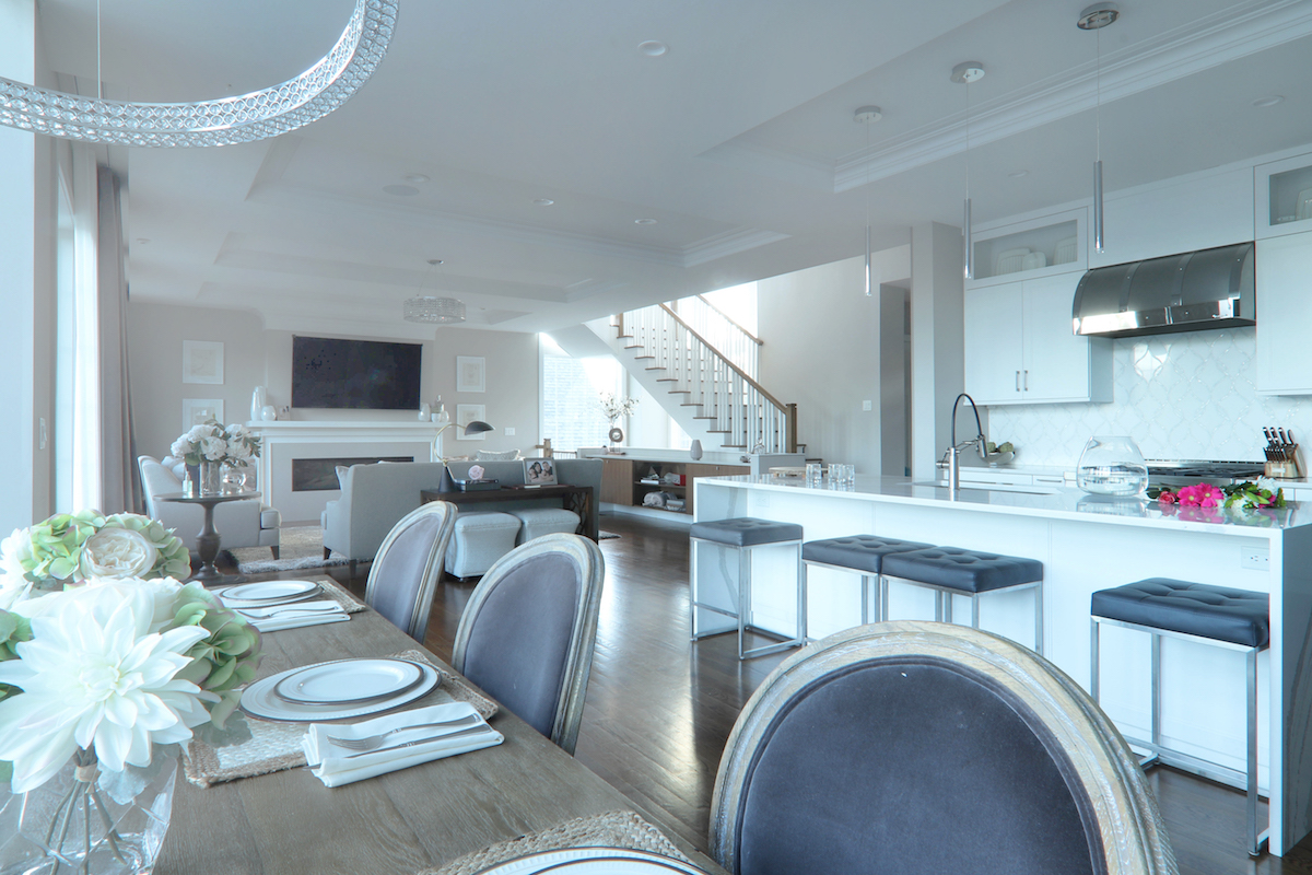 The family draws a clear line between cozy and cluttered. “We’re neat freaks,” Andrea D’Agostino admits. So the design makes use of multiple built-ins, including a long cabinet adjacent to the floating stairway, to hide the detritus of daily living. D’Agostino tucked a large pantry area behind the kitchen wall to keep food-prep messes out of sight. “The downside of living in a house with an open-concept first floor,” he says, “is that if you don’t plan for it, your house is going to look cluttered.”