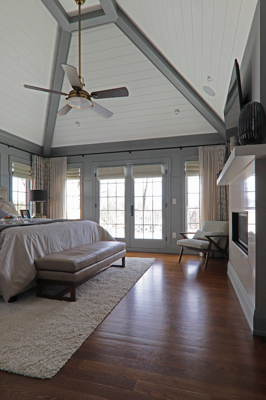The coziest room in the house is probably the master bedroom. Its vaulted ceiling adds drama, but also could have made the room feel excessively stark had it not been for D’Agostino’s deft touches, such as a line of horizontal trim that leads the eye downward and the use of shiplap above it, which provides a series of shadow lines to break up the ceiling space. Adding warmth, quite literally, is a two-sided gas fireplace, one side facing the bedroom and the other the master bathroom, where it complements a clean, modern design featuring a floating vanity and a mirrored wall. D’Agostino designed the bedroom’s eastfacing window so that it would frame the sunrise, in keeping with the home’s “staycation” theme.