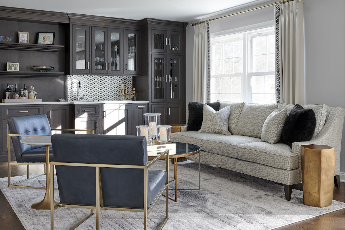 The living room highlights dual abstract originals by Peruvian Jose Ccala as “conversation starters,” she says, while the black cabinetry by Kitchen Expressions gets a pop from the bar area tile’s bold chevron pattern. For style more formal than the adjacent family room, Hendrzak introduced an Ethan Allen couch with a Greek key pattern and gold tones in the tables by British Home Emporium and blue leather chairs.