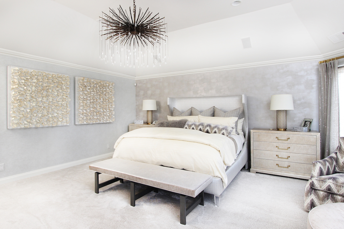 And if you think you see a hint of gold and glitz throughout, your careful eye has picked up on the glam-organic influence. In the den, it’s there in the shimmer of the capiz-shell-front media cabinet, the moth-er-of-pearl trim of the antique mirror atop the fireplace, the metallic element in the faux croc pillows and the gold-leaf abstract brightening the wall. In the bedroom, satin brass is sprinkled about from the lamps to the dresser hardware, and the chandelier is an antique bronze. Palmadessa dabbles in contrasts from a palette including taupe, charcoal and ivory to add just the right dose of oomph—such as the bedroom’s chevron chairs before a restyled fireplace, playing off the more subdued off-white-and-gray carpet.