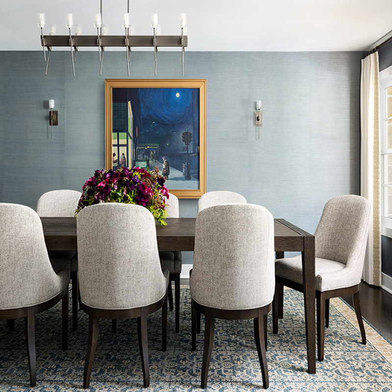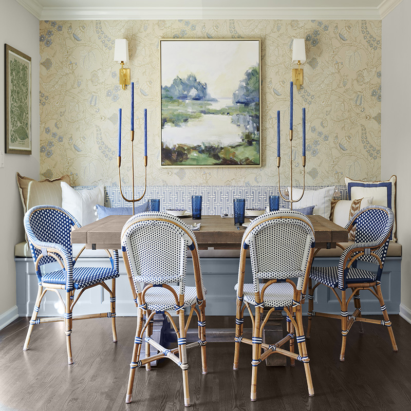 The impressionistic landscape in this Basking Ridge dining room pulls together the yellow and blue tones from the wallpaper and décor, lending the whole space a cohesive look and feel. Designer Pam Cooper created this space with both relaxed family meals and large get-togethers in mind, as opposed to a “stuffy” formal dining room.