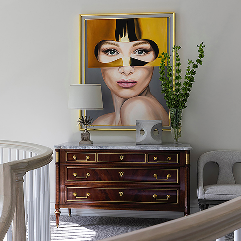 You’d be forgiven for stopping to stare at this art piece hung above a Louis XVI commode in an Upper Saddle River colonial, designed by Robyn Stevens of Silhouette Studios. It’s not only eye-catching, it also adds a contemporary twist to the very classic furniture piece.