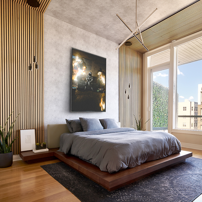 To contrast the low-key, open aesthetic of the rest of the room (where a near-the-ground bed nods to an Asian sensibility), the Big Wall Décor art print behind the headboard is surprising and quirky. In it, an astronaut sits in a burning living room. The client describes it as “really cool.”