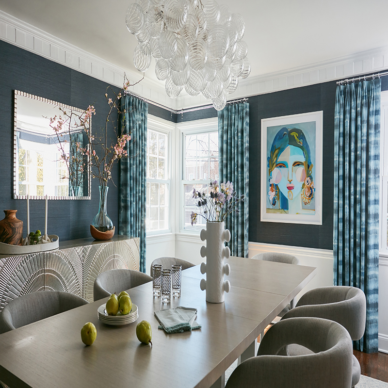 Casual elegance was the name of the game in this South Orange dining room reno, and Sarah Storms of Styled by Storms incorporated large-scale art to pull the whole thing together. A 36-inch-by-48-inch print of artist Hayley Mitchell’s Ka’iuliani, an abstract take on a woman’s portrait, echoes the blues in the curtains and wallpaper.