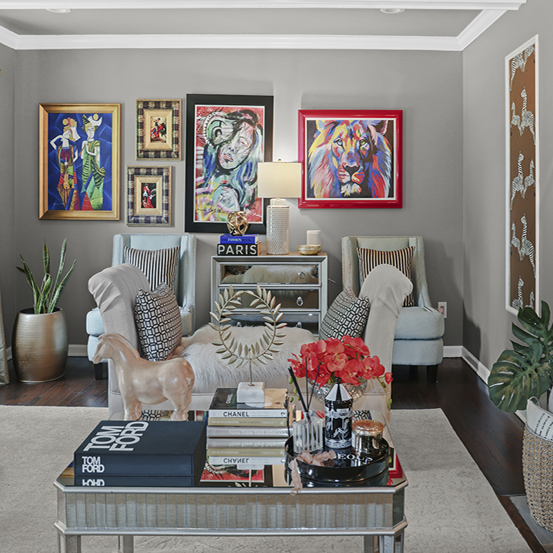 When artist and designer Edelweiss Fromm designed her own Morristown home, she knew she would incorporate the art that she and her husband collected while traveling the world. Though this living room has a neutral color scheme, the art on the wall gives the impression of being enveloped in color.