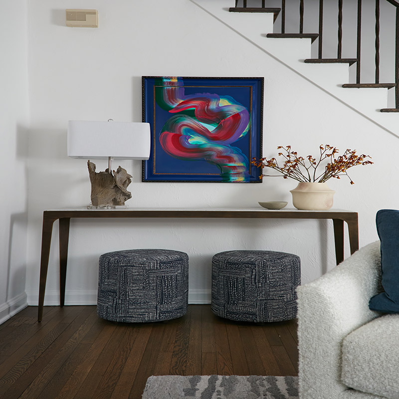 Designer Liz Curry made every space count when updating this home in Millburn. The sleek and modern Hancock table by Vanguard Furniture already gets some dressing up from a Surya driftwood lamp, but the Jesús Núñez abstract steals the show.