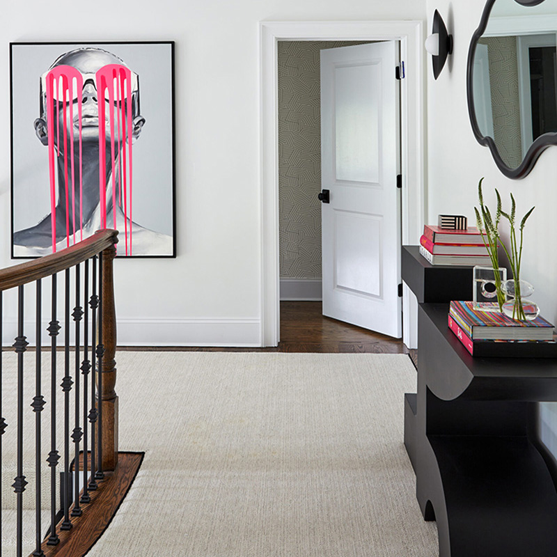 When designing a Demarest colonial, Abby Gruman of Abby Leigh Designs took inspiration from her client and friend’s love for the fun and funky. In the second-floor hallway, this print offers a vibrant burst of hot pink that elevates, rather than crowds out, the sleek minimalist aesthetic.