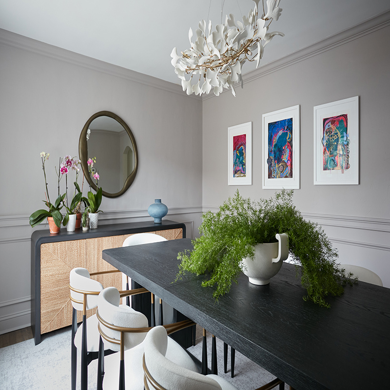 In the dining room, the vibe is moodier, thanks to the warm, gray hue of Farrow & Ball’s Dove Tale paint. The Restoration Hardware Bre ton extension dining table offers ample seating and legroom to entertain in chic comfort. Arhaus Jagger side chairs with metal detailing and Pottery Barn Baldwin barrel back swivel head chairs complement without being matchy-matchy.