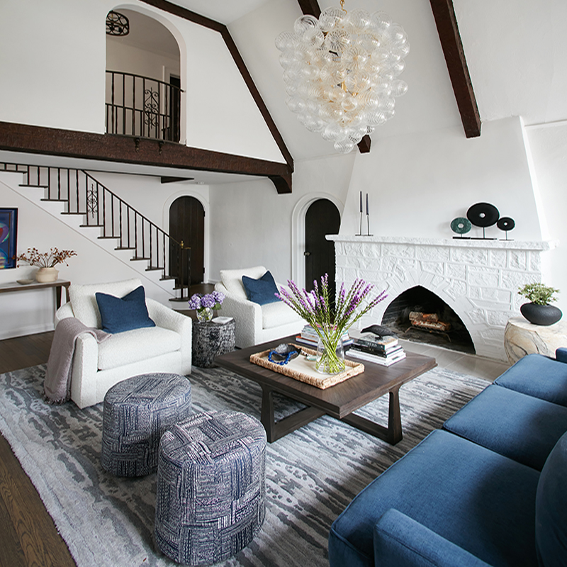 All fabrics and rugs were comfortable, ultra-durable and easy to clean. (“This was super-important given all the white chairs,” says the designer. “Just because it needs to be pet and kid friendly doesn’t mean it can’t be white.”) Side tables—such as the concrete Kenmore piece by the fireplace—are heavy and hard to tip, important child safeguards.