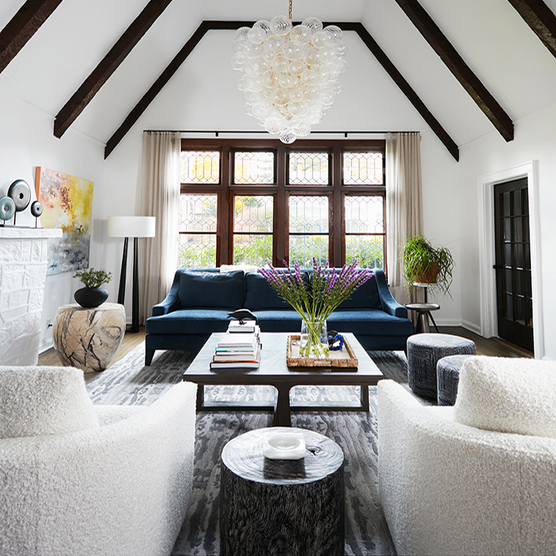 “The vaulted ceiling and beams are absolutely spectacular, and restoring the original woodwork was very important,” Curry says. “We love the high contrast of the original beams, and many of our decisions were based on their dark tones. The new stain on doors, the dark coffee table and the dark dining table are all in response to bringing down the ceiling’s dark tones to the lower level of the spaces to provide balance.”