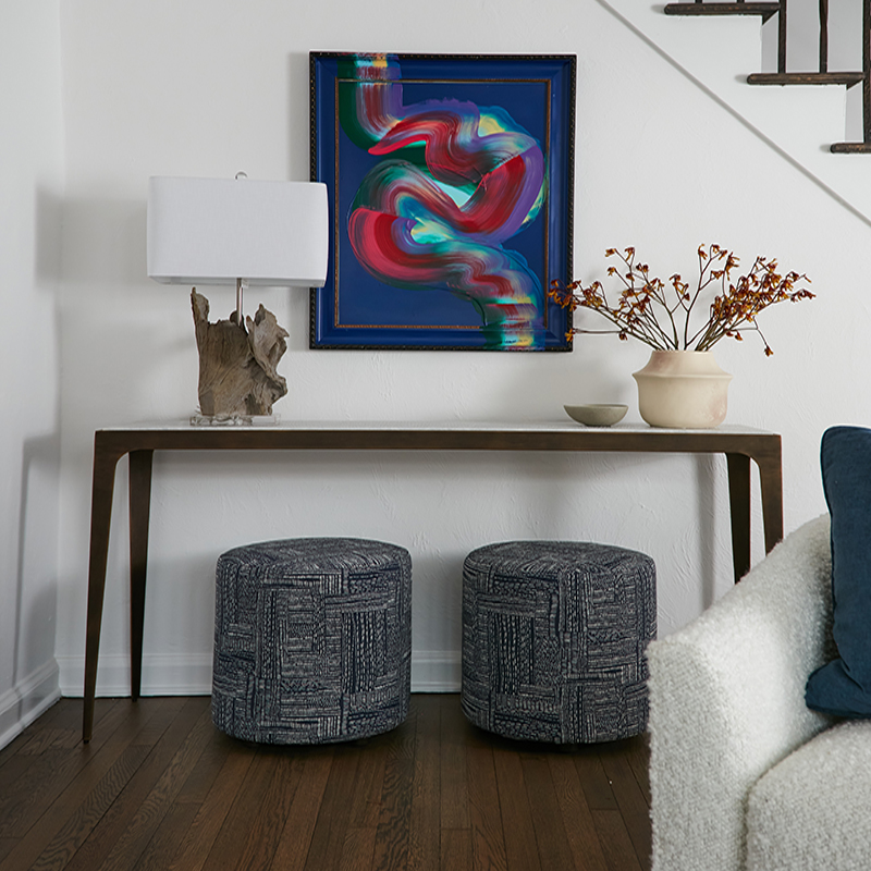Between the armchairs, the Jayson Home wood-stump table pays homage to the ceiling’s beams while the dark-toned Artistica Home Rousseau coffee table helps ground the seating group. The Bernhardt Pisa ottomans, custom-upholstered in Rebecca Atwood fabric featuring a white stitch over navy background, supplement the other seating pieces. Decorative touches such as the Toral Patel painting from J. Nunez Gallery, the Lily’s Living marble disk sculptures atop the mantel and the Scala hand-forged floor lamp, enhance the room’s appeal.