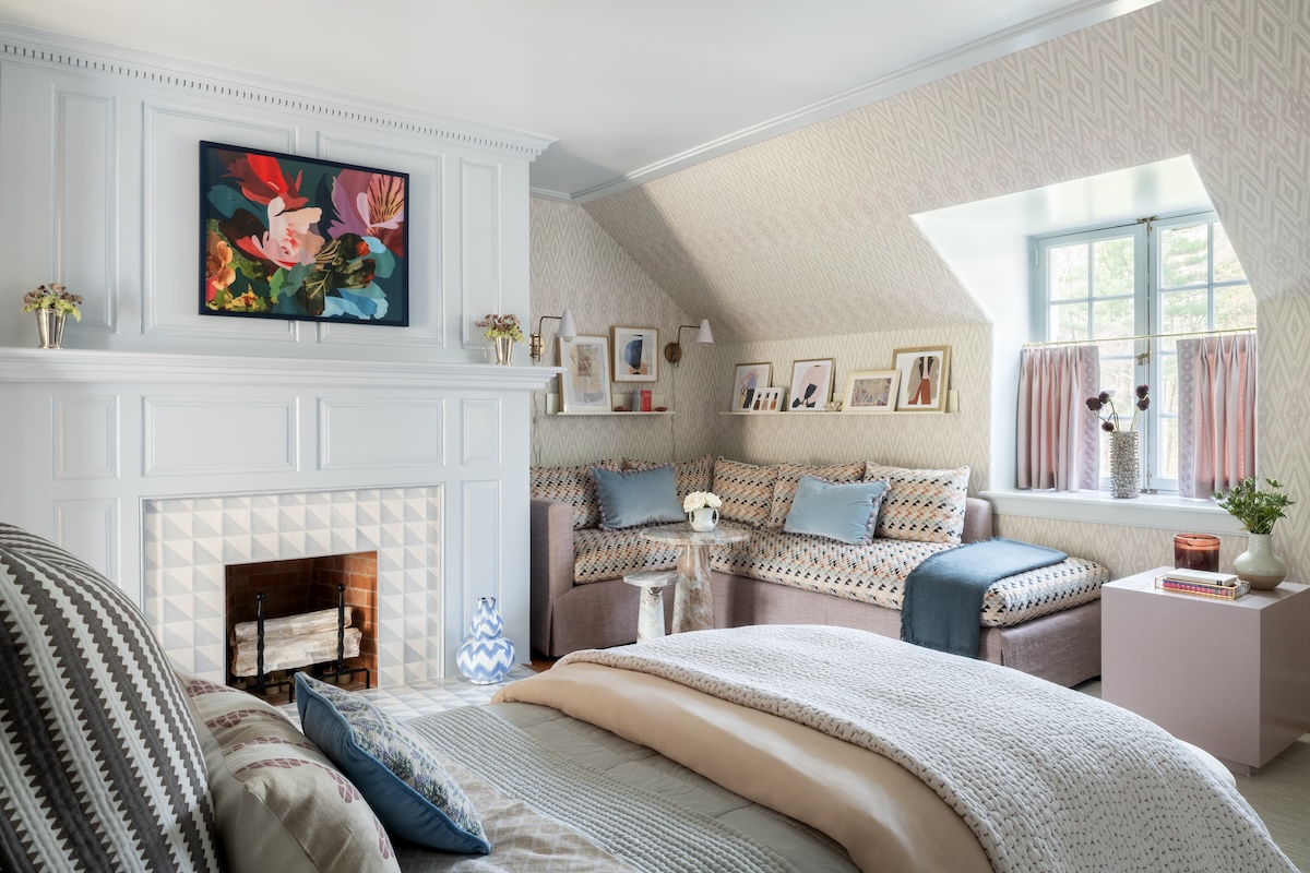 The custom pink-velvet bed, dressed in a John Robshaw quilt and Stamattina sheets, claims the spotlight. The canopy—in lilac-hued linen Kravet fabric—practically begs for a Saturday morning sleep-in. Nearby, a custom corner banquette accented with perky pillows from Pepper Home provides a cozy perch for reading or chatting with friends. Decorative shelving above displays artwork and travel mementoes; the Alder & Ore marble nesting tables offer contemporary, space-saving style. A hidden vanity nook— formerly a closet—adds a surprise element. Over the fireplace, Dana McClure’s mixed-media artwork, sourced from Chatham-based CSM Art & Frame, blooms vibrantly.