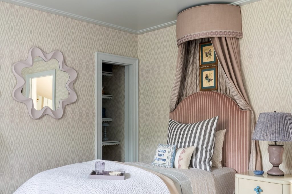A neutral foundation—the softly patterned wallpaper—allows for evolving accent colors, while the mix of textures, patterns and tones keeps the space feeling alive and youthful without locking it into one specific age group.