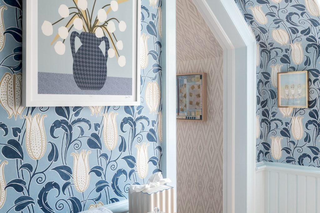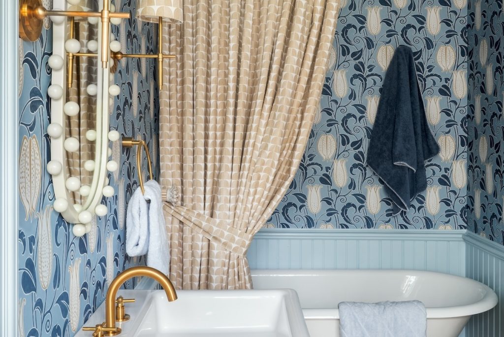 In the bathroom, Cohen preserved the original hardwood floors and vintage clawfoot tub, rejuvenating them with Kravet’s Ronald Redding Canterbury Bells wallpaper. Scalloped Matouk towels, a custom bath curtain and matching lampshades in Thibaut fabric, brass fixtures from DXV and Grohe, a “bubbles” wall mirror and Visual Comfort sconces strike a chic balance between nostalgia and in-the-now style.