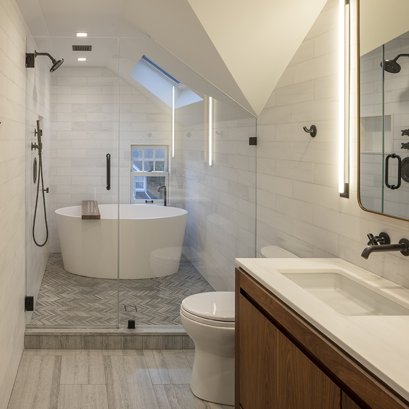 Because of its odd angles, the primary bathroom in this renovated Montclair home was once dark and cramped. However, designers Wayne and Annie Norbeck, who are also the homeowners, expanded it into an adjoining hallway, used pale colors and added skylights, including one in the new shower, to usher in natural light.