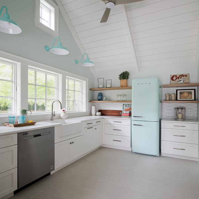 To give the kitchen of an Allendale home a beachy feel, designer Mary Fitzpatrick Scro used white shiplap on the steep cathedral ceiling to give the space a bright, airy feel.