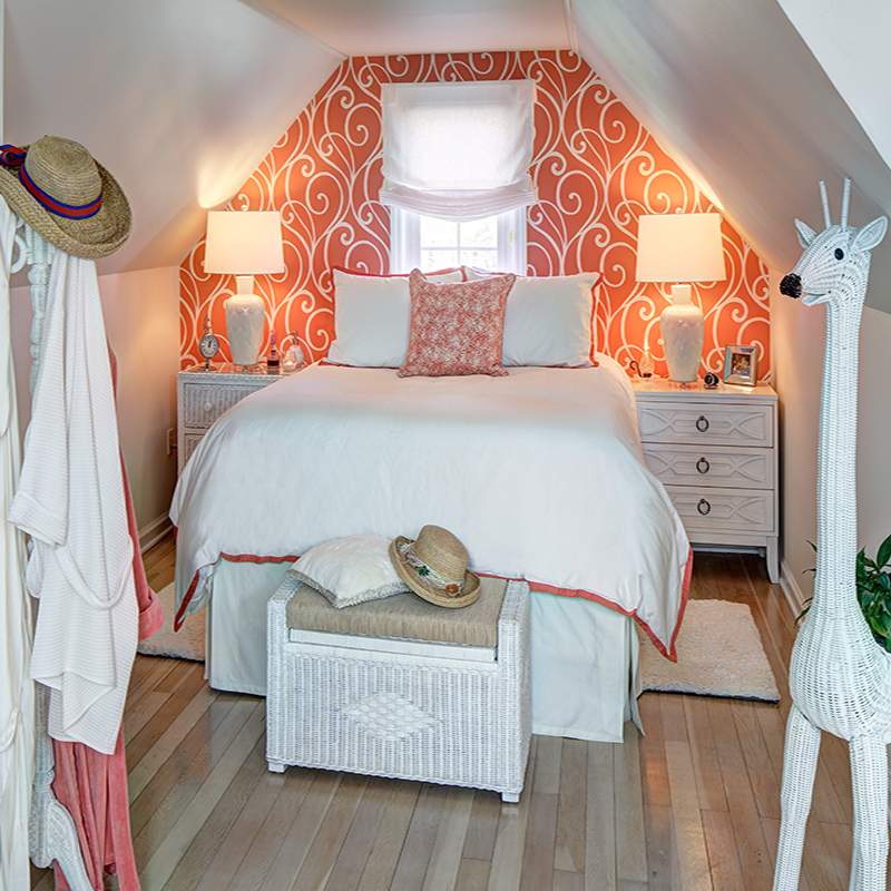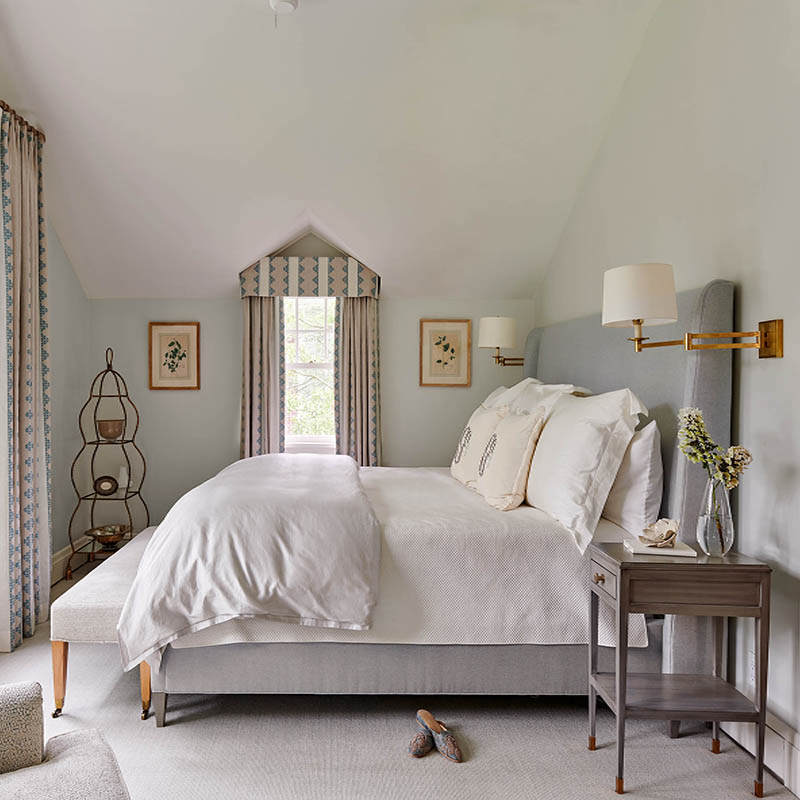 Designer Judy Sturdevant gave a 1920s center hall colonial in Westfield a total makeover, but it wasn’t without challenges. Dormer windows in the primary bedroom were the first hurdle, but Sturdevant embraced the quirky architecture, “fabricating cornices and panels” and using an upholstered winged bed to soften the edges.