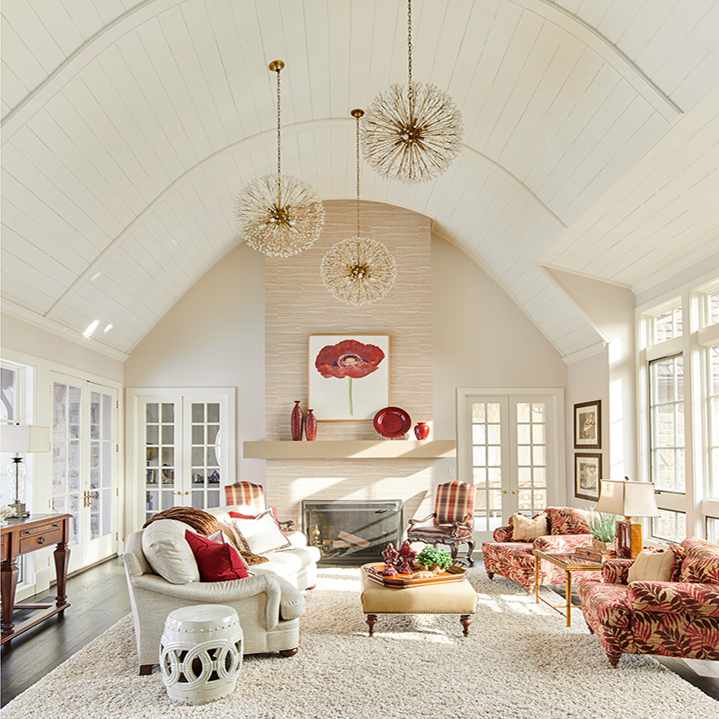 Hoping to create a seashore feel in their Far Hills home, the owners asked designer Pam Cooper to reimagine their open living room. Cooper reworked the architecture, turning a flat ceiling into a soaring 20-foot planked barrel design. “The plank boards gave it beautiful dimension,” she says.