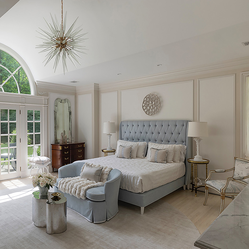 When her 1990s Saddle River colonial cried out for a redo, owner/interior designer Robyn Stevens got to work. In her bedroom, she chose watery blue hues for serenity and restfulness and complemented the barrel-vaulted ceiling with a starburst chandelier in Italian Murano glass.