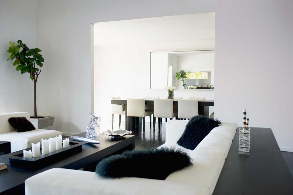 With white walls and chairs plus a matching couch dominating this room, a black table, console and pillows add balance.